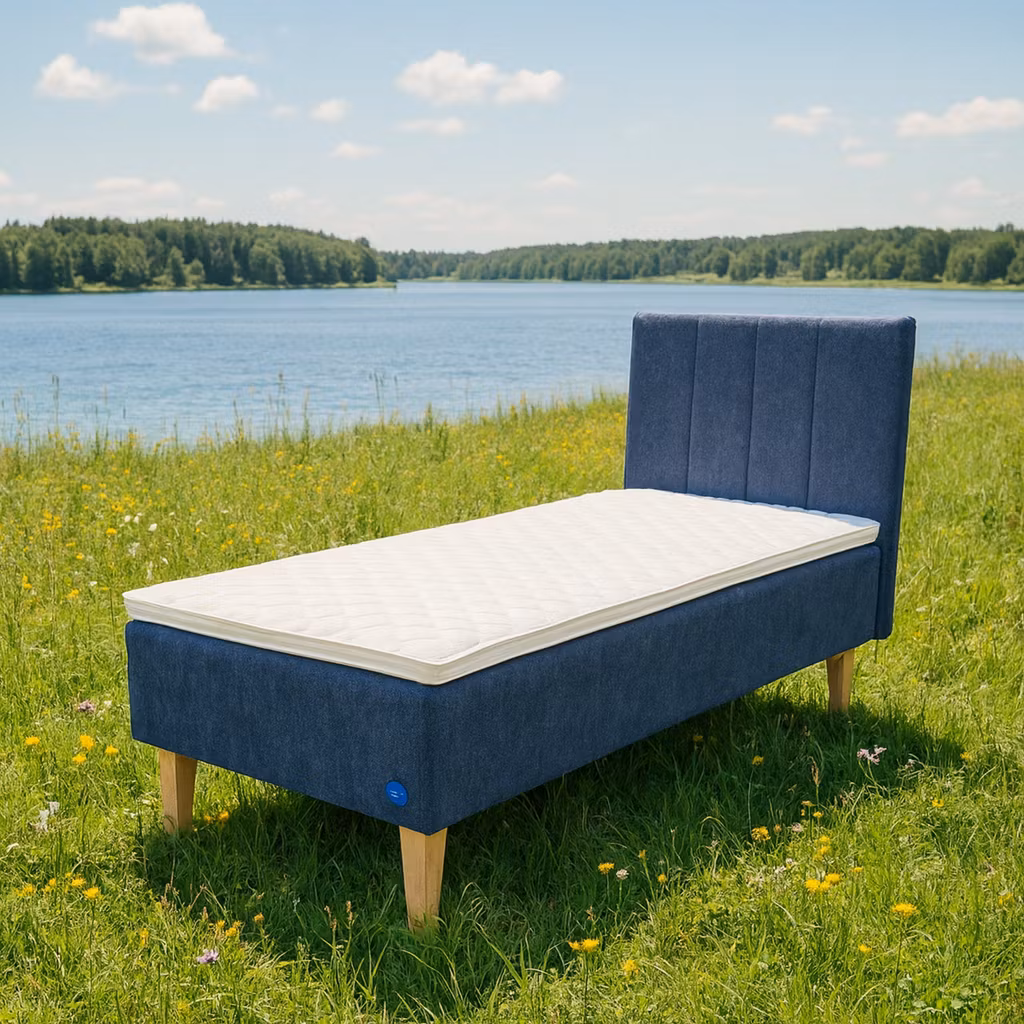 Vår bäddmadrass av naturlatex med 3 cm kärna som ger den extra följsamhet, ca 5 cm tjock, erbjuder en sval och följsam sovkomfort. Med sin andningsförmåga anpassar den sig perfekt efter din kropp.