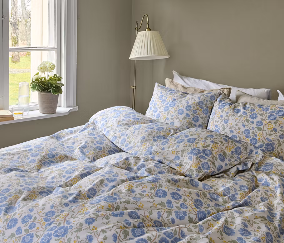 Bella Blå bäddset kännetecknas av sitt harmoniska blommönster som skapar en lugn och inbjudande atmosfär. Den ljusa färgskalan gör det enkelt att matcha med andra textilier och inredningsdetaljer.