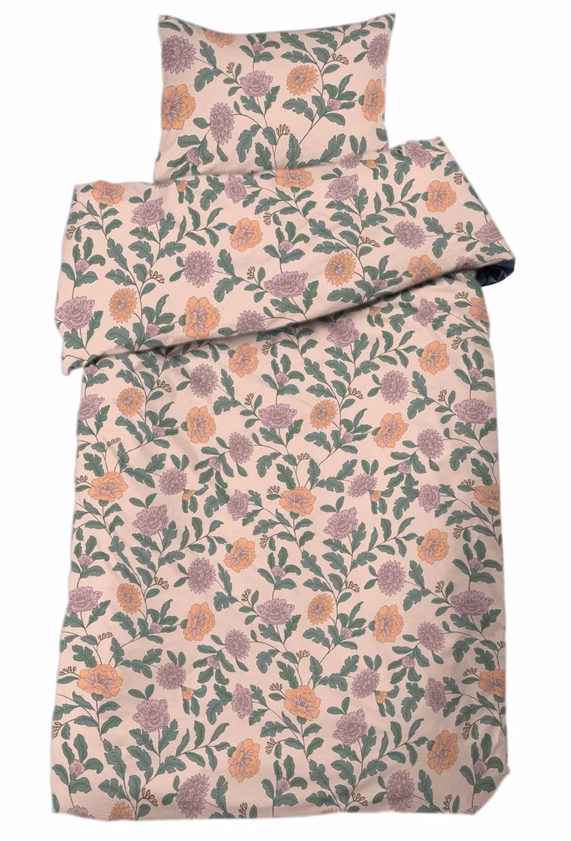 Det romantiska blommönstret är elegant utformat för att ge liv åt sängen utan att ta över rummet. Persikatonen tillför värme och mjukhet och gör bäddsetet lätt att kombinera med både ljusa och naturinspirerade inredningsdetaljer. Resultatet är ett sovrum som känns rofyllt, harmoniskt och personligt.