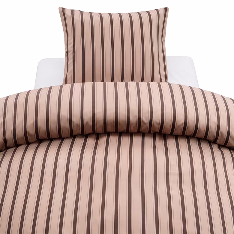 Miranda Brun kännetecknas av sitt stilrena randmönster som ger sovrummet ett sofistikerat men samtidigt varmt intryck. Kombinationen av mörka och ljusa bruna nyanser skapar balans och gör bäddsetet lätt att matcha med både ljusa och mörka inredningsdetaljer.